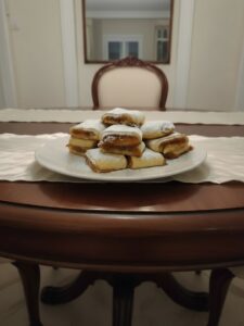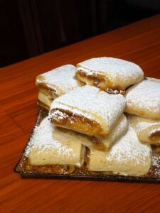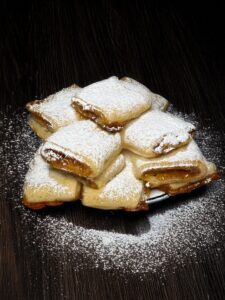 Dopo il riposo, si stende la frolla in rettangoli sottili, si distribuisce la marmellata di fichi al centro e si richiude formando un rotolino. Si tagliano dei biscotti rettangolari e si sistemano su una teglia rivestita di carta forno.