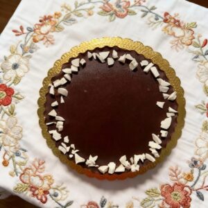 Prepara la copertura scaldando la panna e versandola sul cioccolato fondente tritato, mescolando fino a ottenere una ganache liscia. Lasciala intiepidire e versala sulla cheesecake ormai soda. Rimetti in frigo per almeno 1 ora.