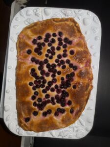 In una ciotola sciogli il lievito nell’acqua leggermente tiepida, aggiungi la farina e inizia a impastare. Unisci anche lo zucchero e l’olio, quindi per ultimo il sale. Lavora fino a ottenere un impasto morbido e liscio. Copri e lascia lievitare fino al raddoppio. Dividi l’impasto in due parti. Stendi la prima metà nella teglia ben unta d’olio, distribuisci sopra metà dei chicchi d’uva e spolvera con zucchero. Copri con l’altra metà dell’impasto steso e sigilla i bordi. Disponi sopra la restante uva, ancora zucchero e un filo d’olio. Lascia lievitare ancora circa 30 minuti. Cuoci in forno statico già caldo a 180°C per 35-40 minuti, finché la superficie sarà dorata e caramellata.