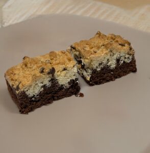 Per la copertura, si impasta la farina con il burro e lo zucchero fino a formare briciole, poi si uniscono le gocce di cioccolato. Si distribuisce il crumble sulla superficie dei brownies e si inforna a 180°C per circa 25-30 minuti, finché la superficie sarà dorata ma l’interno ancora morbido. Si lascia raffreddare e si taglia a quadrotti.