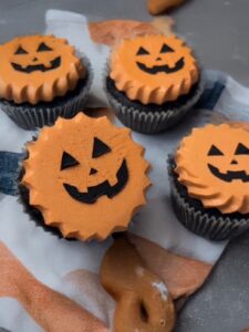 Una volta solidificato, ogni disco viene adagiato sopra i cupcake e lasciato scongelare leggermente per aderire bene. Con uno stencil e la panna nera montata (colorata con colorante nero), si realizza il viso di Jack O’ Lantern, disegnando occhi, naso e sorriso.