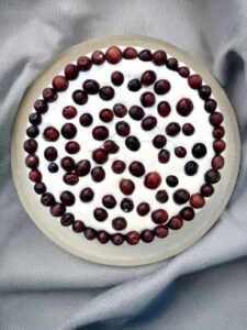 Prima di servire, i restanti chicchi d’uva vengono adagiati sulla superficie, creando un effetto elegante e naturale. Ogni morso regala un contrasto piacevole tra il croccante della base, la morbidezza della crema e la freschezza dell’uva.