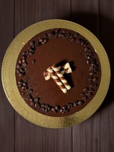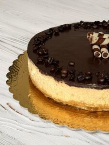 La Cheesecake al Caffè è un dolce fresco, cremoso e profumato, perfetto per chi ama i dessert dal gusto deciso ma avvolgente. La base croccante di biscotti accoglie una crema morbida e vellutata al caffè, arricchita da formaggio spalmabile, mascarpone e panna che si fondono in una consistenza irresistibile. La copertura al cioccolato fondente aggiunge un tocco elegante e un contrasto che esalta ancora di più l’aroma del caffè.
