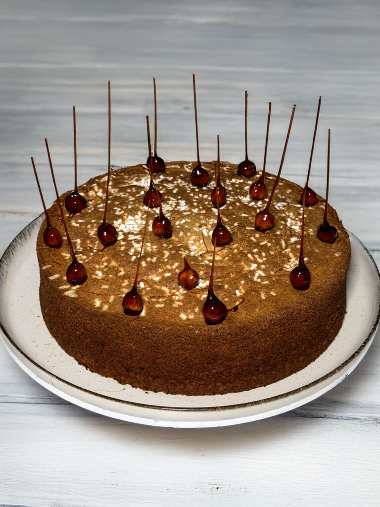 Versa l’impasto in uno stampo da 24 cm già imburrato e infarinato (o foderato con carta forno) e cuoci in forno statico a 170°C per circa 45–50 minuti. Fai la prova stecchino prima di sfornare. Lascia raffreddare completamente prima di sformare e guarnire a piacere.