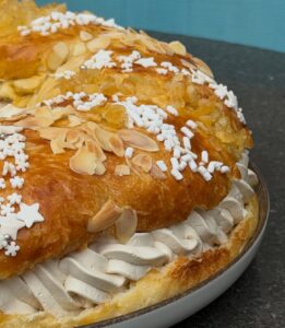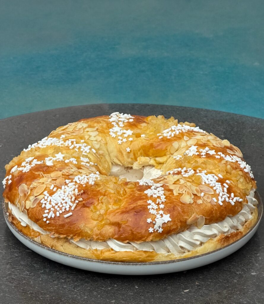 Il Roscón de Reyes è uno dei dolci più simbolici della tradizione spagnola, preparato in occasione dell’Epifania e legato al rito dei Re Magi. Si tratta di una grande ciambella soffice, profumata agli agrumi e ai fiori d’arancio, decorata con frutta candita e zucchero, che richiama una corona reale. In questa versione viene utilizzato il metodo della biga in acqua, una tecnica artigianale che prevede di immergere il preimpasto in acqua calda e attendere che galleggi per verificarne la maturazione. Questo passaggio garantisce un impasto più leggero, alveolato e digeribile, con un profumo intenso e una consistenza estremamente morbida. L’impasto viene arricchito con burro, uova e aromi naturali, lavorato lentamente e lasciato lievitare fino a raggiungere una struttura elastica e setosa. Dopo la formatura a corona e una seconda lievitazione, il Roscón viene decorato e cotto fino a ottenere una doratura uniforme. Tradizionalmente al suo interno si nasconde una piccola sorpresa, simbolo di fortuna e convivialità. Può essere gustato al naturale oppure farcito con panna montata, crema pasticcera o crema al cioccolato, diventando il protagonista indiscusso della tavola dell’Epifania.