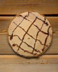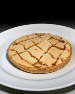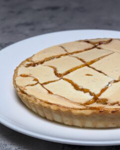 La crostata cuoce in forno statico a 170–175°C fino a quando la superficie risulta asciutta, lucida e leggermente croccante. Una volta fredda, la crostata è pronta per essere tagliata, regalando al morso il classico “crack” della sfogliatina.