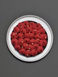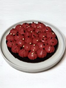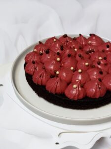 Questo brownie decorato è una versione elegante e scenografica di uno dei dolci al cioccolato più amati. Una base morbida e intensa, dal cuore fondente, accoglie una nuvola di crema setosa color rubino, modellata in ciuffi regolari che trasformano il brownie in una vera torta da festa. Il contrasto tra il cacao profondo e la crema delicata al mascarpone rende ogni morso equilibrato, goloso e sorprendente.