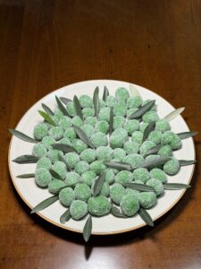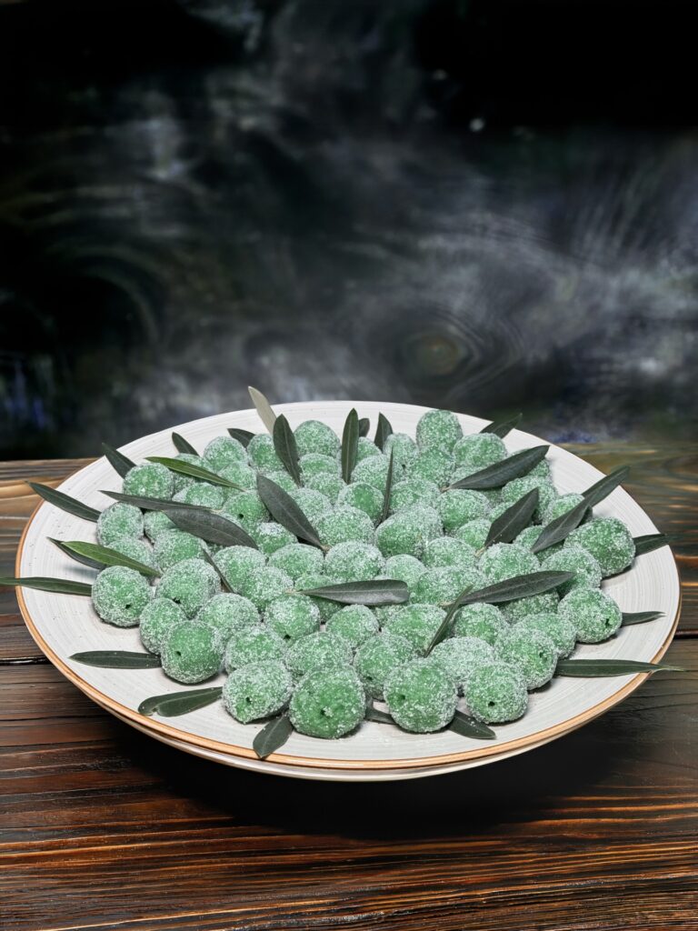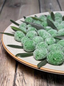 Le Olive di Sant’Agata sono un dolce tipico campano a base di pasta di mandorle, profumatissimo e scenografico. Piccole, verdi, lucide e rotolate nello zucchero, ricordano in tutto e per tutto le vere olive, ma al morso sprigionano il gusto intenso della mandorla con una delicata nota di limoncello e mandorla amara. Una ricetta semplice, senza cottura, che profuma di tradizione e che in pochi minuti regala un dolce elegante perfetto per vassoi delle feste, ricorrenze o fine pasto.