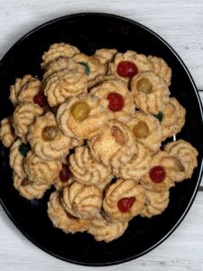 Decoro al centro con una ciliegia candita oppure con una mandorla intera e spolvero leggermente con zucchero a velo.