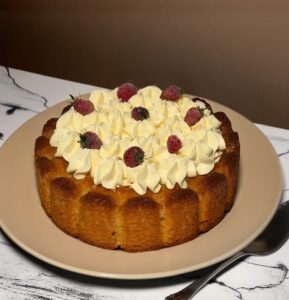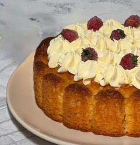 A completare il tutto, una generosa decorazione di crema Chantilly montata a ciuffi, leggera e vellutata, che aggiunge eleganza e armonia ad ogni fetta. È il dolce perfetto per la colazione, la merenda o per concludere un pranzo in modo delicato ma scenografico.