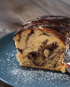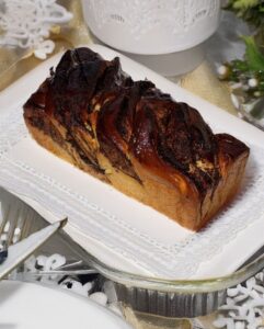 La babka al cioccolato è un grande lievitato scenografico, ricco e profumato, caratterizzato dall’intreccio che lascia intravedere le sue venature golose.