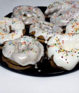 Immergete o spennellate i taralli ormai freddi con la glassa e decorate con zuccherini colorati.
