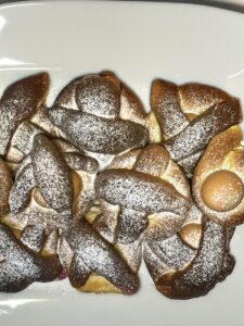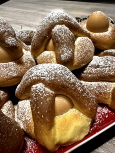 Un dolce della tradizione che profuma di casa e di Pasqua, preparato soprattutto per la colazione del Giovedì Santo, quando le cucine si riempiono di gesti antichi e sapori autentici. Un impasto morbido e leggermente rustico, arricchito da burro, uova e profumo di limone, che prende forma nelle classiche intrecciature con l’uovo al centro, simbolo di rinascita e condivisione. Perfetto da gustare al mattino, racconta una storia fatta di semplicità e tradizione tramandata nel tempo.