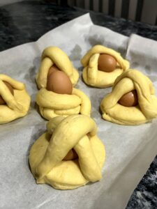 Lasciare lievitare in una ciotola coperta in un ambiente tiepido fino al raddoppio. Riprendere l’impasto, formare i viccilli nelle forme tradizionali e inserire al centro le uova crude ben pulite, e ingabbia l’uovo con delle strisce di impasto. Disporre su teglia con carta forno e lasciare lievitare nuovamente fino a quando risultano ben gonfi.