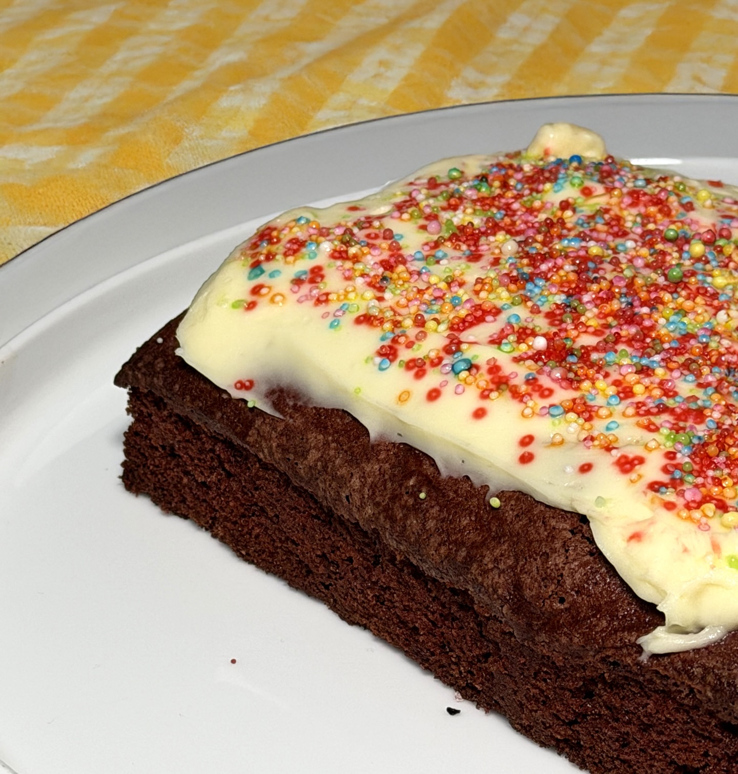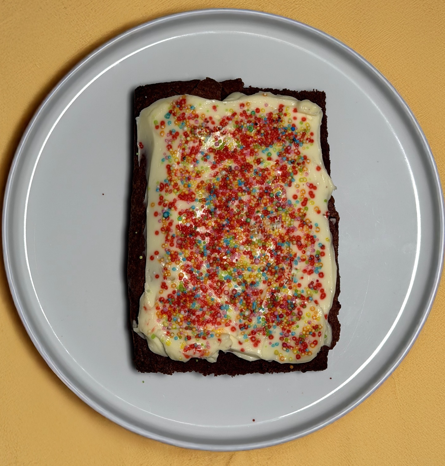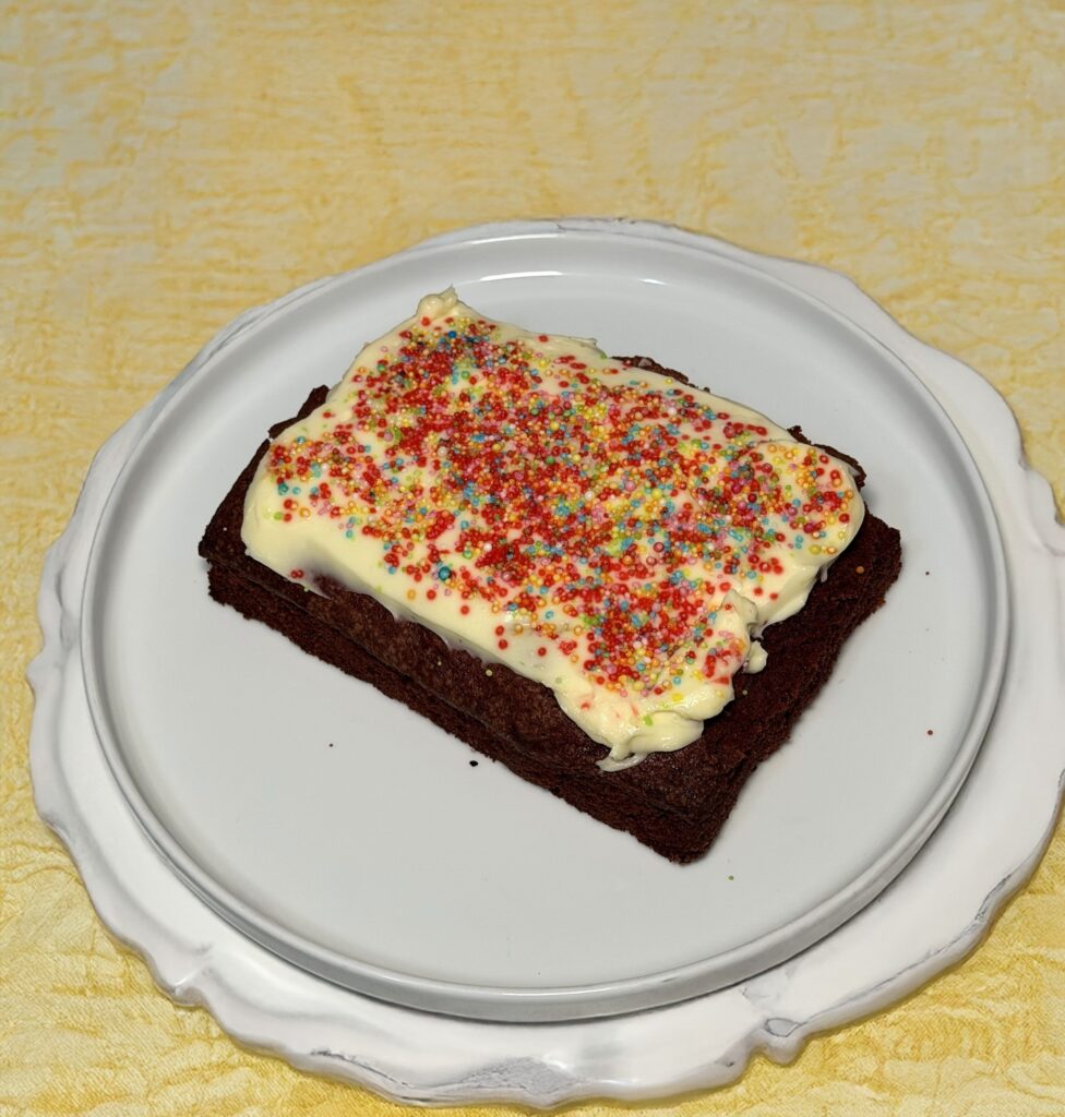 Un dolce che conquista al primo sguardo e ancora di più al primo morso. Questo brownie è intenso, umido al punto giusto, con quella consistenza che si scioglie lentamente in bocca. Sopra, una copertura morbida e avvolgente di cioccolato bianco che crea un contrasto perfetto con la base al cacao, completata da una pioggia di zuccherini colorati che regalano allegria e croccantezza. È uno di quei dolci semplici ma capaci di sorprendere, perfetto per ogni momento della giornata.